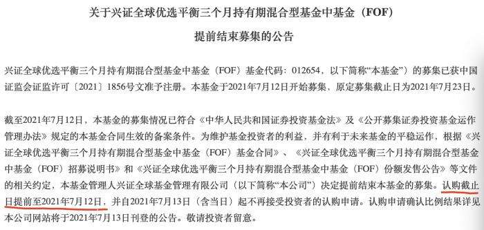 当天下午,兴证全球基金发布了提前结束募集公告,宣布认购截止日由2021年7月23日提前至2021年7月12日。