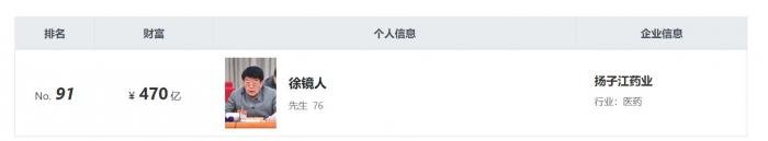 2020年10月20日,徐镜人以470亿元位列《2020年胡润百富榜》第91位,这一年,他已经76岁,扬子江药业成立已有49个年头。