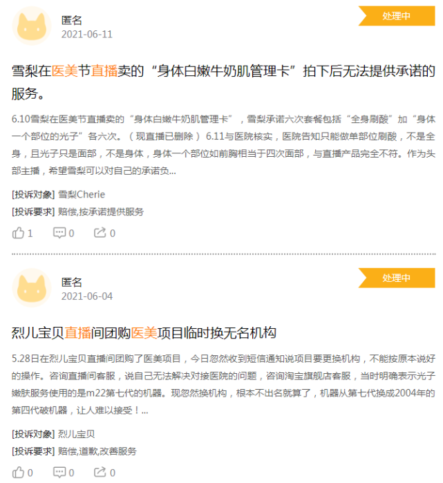 在黑猫投诉上,也可以看到消费者对医美直播的投诉。