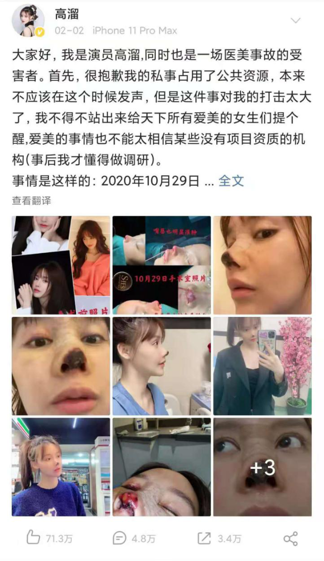 今年2月,有一位名叫高溜的演员遇上了没有项目资质的机构,导致脸部受到损伤,为许多爱美的女性提了个醒。