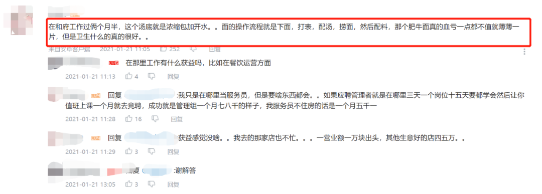一位疑似在和府捞面工作过的网友在该视频评论区中也表示“在和府工作过俩个月半,这个汤底就是浓缩包加开水……面的操作流程就是下面,打表,配汤,捞面,然后配料,那个肥牛面真的血亏一点都不值就薄薄一片”。
