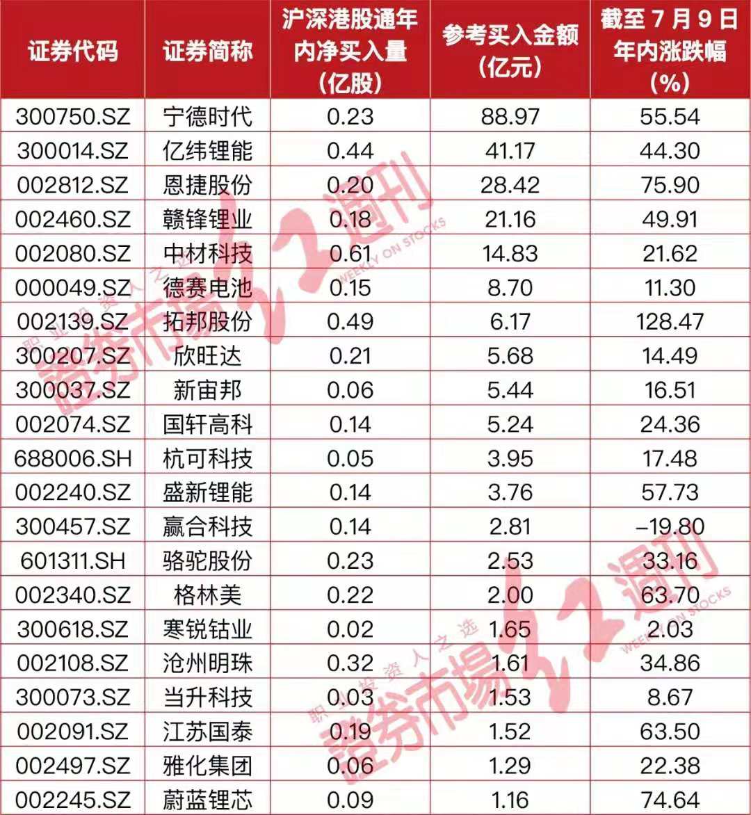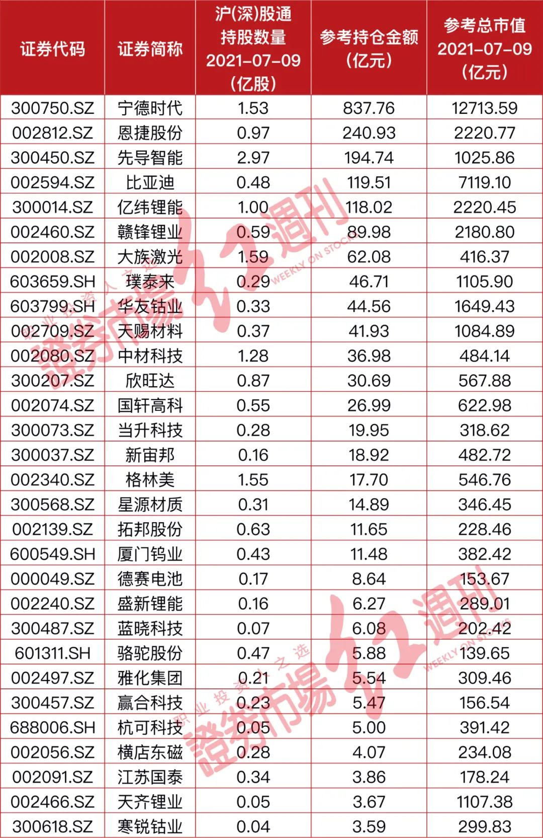 今年以来,北上资金对锂电公司继续给予大笔增仓。另据统计显示,北上资金年内买入锂电池板块参考总金额已达436亿元。其中,宁德时代、亿纬锂能、恩捷股份、赣锋锂业、中材科技5家获北上资金买入超过10亿元,买入宁德时代金额最高达88亿元。(见表1、表2)