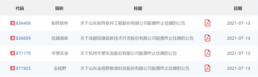 7月13日,新三板基础层公司矩阵软件、欣捷高新、华塑实业、金视野终止挂牌。