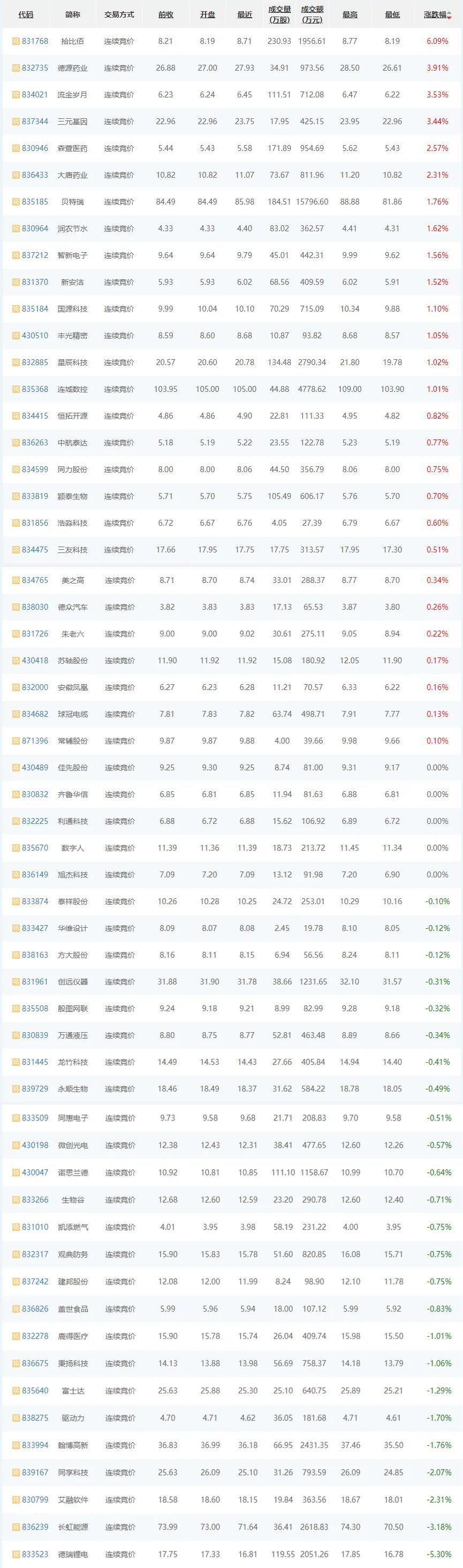 7月13日,精选层涨跌互现,27家企业上涨,5家平盘,25家下跌。其中,拾比佰(831768)涨幅居首,上涨6.09%;其次,德源药业(832735)上涨3.91%;德瑞锂电(833523)跌幅居首,下跌5.30%;长虹能源(836239)居次下跌3.18%;佳先股份(430489)、齐鲁华信(830832)等平盘。