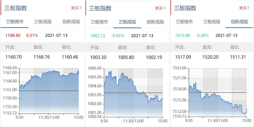 截至7月13日收盘,三板做市报1166.60点,上涨0.51%;三板成指报1002.72点,下跌0.05%;三板创新报1512.89点,下跌0.28%。