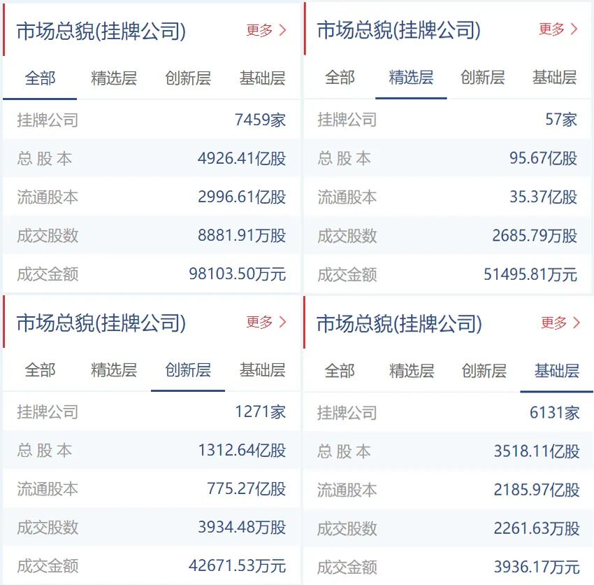 截至7月13日收盘,今日成交金额为9.81亿元,精选层成交金额为5.15亿元,创新层成交金额为4.27亿元,基础层成交金额为0.39亿元;今日成交股数为8881.91万股,精选层成交股数为2685.79万股,创新层成交股数为3934.48万股,基础层成交股数为2261.63万股。