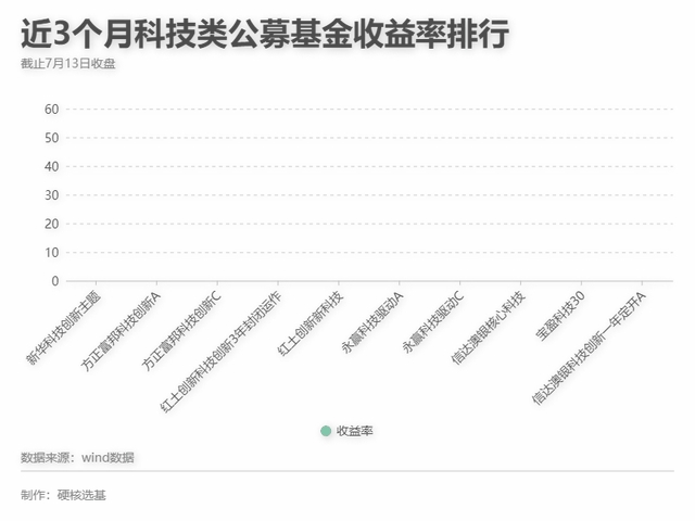 在过去的3个月中,以科技为名的主题基金中,收益排名前十的,有3只收益超60%,2只超50%,5只超40%。
