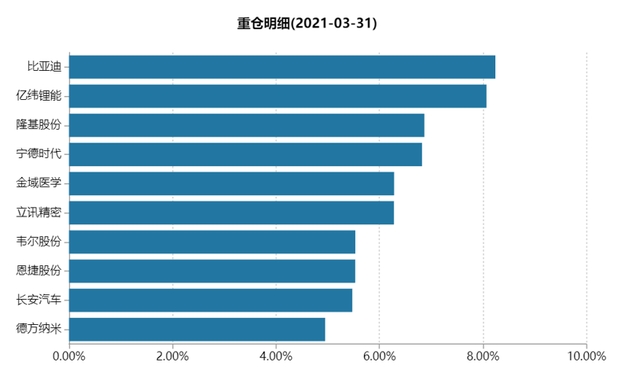 目前该基金的前五大重仓股为比亚迪、亿纬锂能、隆基股份、宁德时代、金域医学。