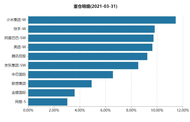 目前该基金的前五大重仓股为小米集团、快手、阿里巴巴、美团、腾讯控股。