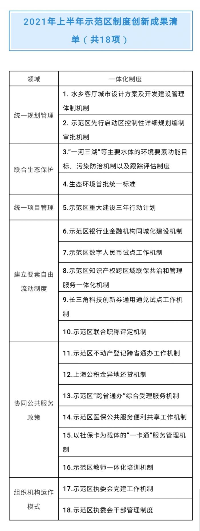 据长三角一体化示范区执委会副主任、上海市发展改革委副主任张忠伟介绍,2021年上半年,长三角一体化示范区共推出了18项制度创新成果。这18项制度成果主要集中在规划管理、生态保护、项目管理、要素流动、公共服务和体制机制等重点领域。