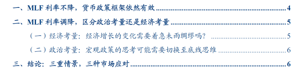 假如MLF利率不降,意味央行的货币政策操作框架尚未改变,当下货币政策基调依然是稳字当头。货币政策方向不看准备金率(量),要看政策利率(价)。我们对于央行操作的理解仍应在原有框架的特征内——