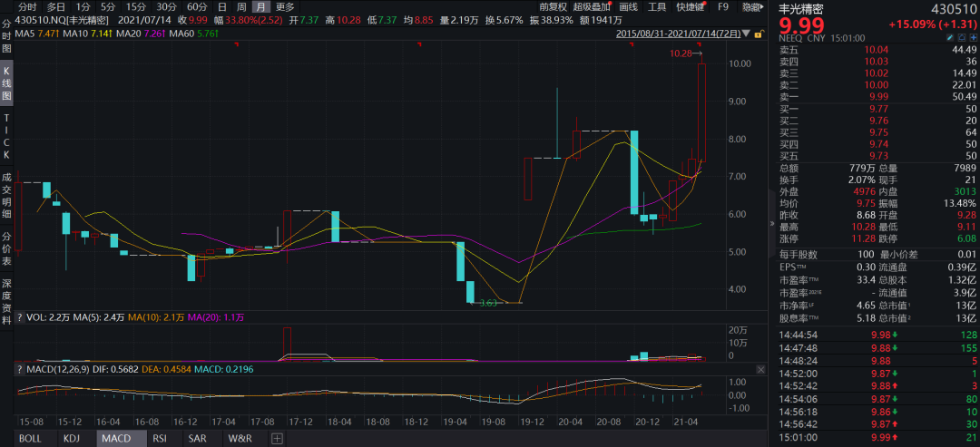 7月14日,丰光精密(430510)收涨15.09%,涨幅居首,盘中股价也创出历史新高。