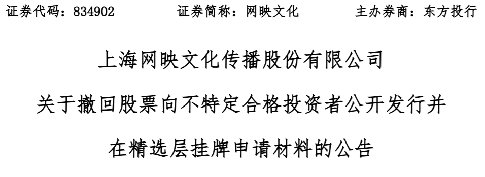 7月14日,网映文化(834902)发布公告称,公司撤回精选层挂牌申请材料。