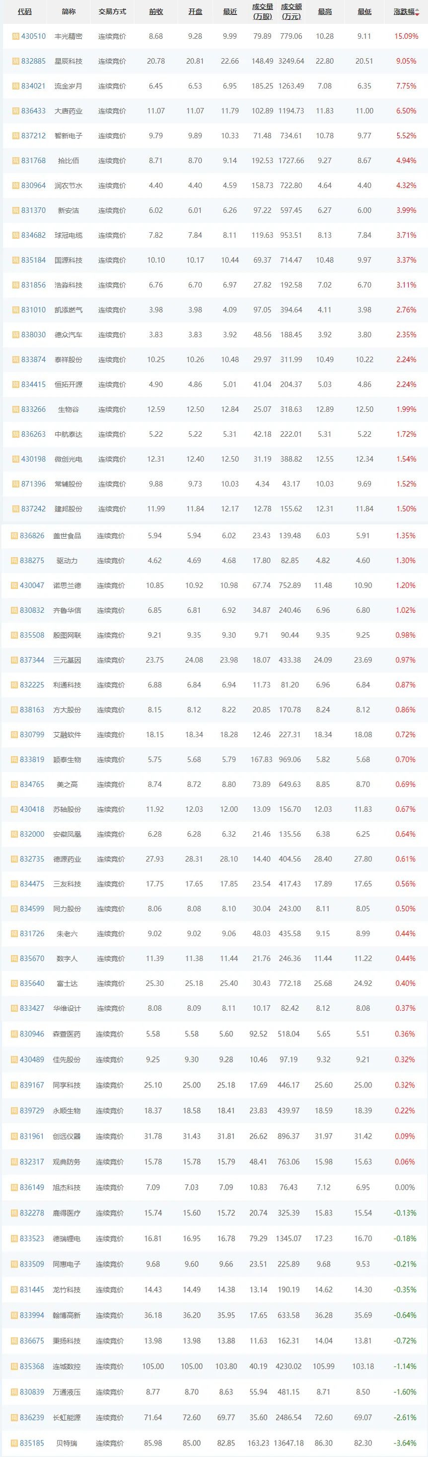 7月14日,精选层普涨,46家企业上涨,1家平盘,10家下跌。其中,丰光精密(430510)涨幅居首,上涨15.09%;其次,星辰科技(832885)上涨9.05%;贝特瑞(835185)跌幅居首,下跌3.65%;长虹能源(836239)居次下跌2.61%;旭杰科技(836149)平盘。