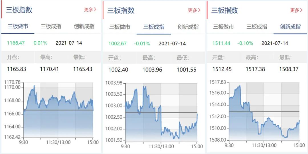 截至7月14日收盘,三板做市报1166.47点,下跌0.01%;三板成指报1002.67点,下跌0.01%;三板创新报1511.44点,下跌0.10%。