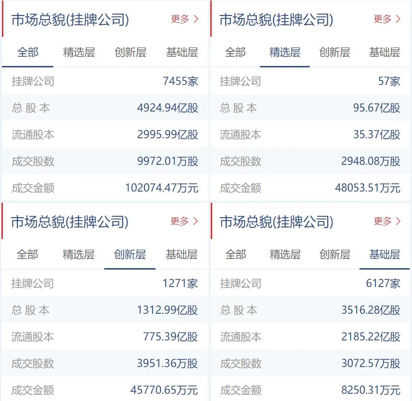 新三板挂牌公司总计7455家(精选层57家,创新层1271家,基础层6127家),总股本4924.94亿股,流通股本2995.99亿股。