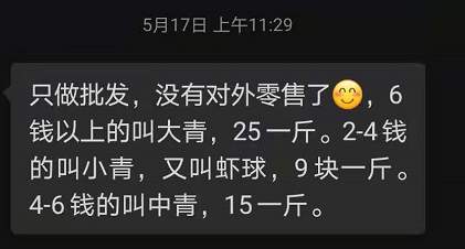 大青一般会被高端餐馆收走,中青被虾贩和代理商流入市场、大排档,而小青主要卖到菜市场,收购价一斤10元不到,和大青相比差一倍价格。