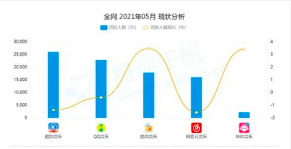 从用户数据上来看,酷我在整个腾讯音乐板块处于垫底位置。据易观分析的数据显示,2021年5月,酷狗音乐的活跃用户数约为2.5亿人,QQ音乐超过2亿人,酷我音乐这一数据不超过2亿人。