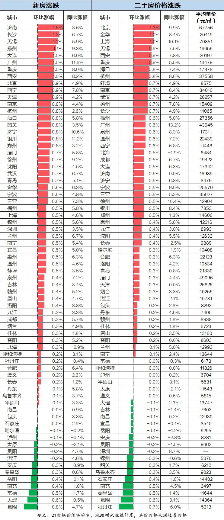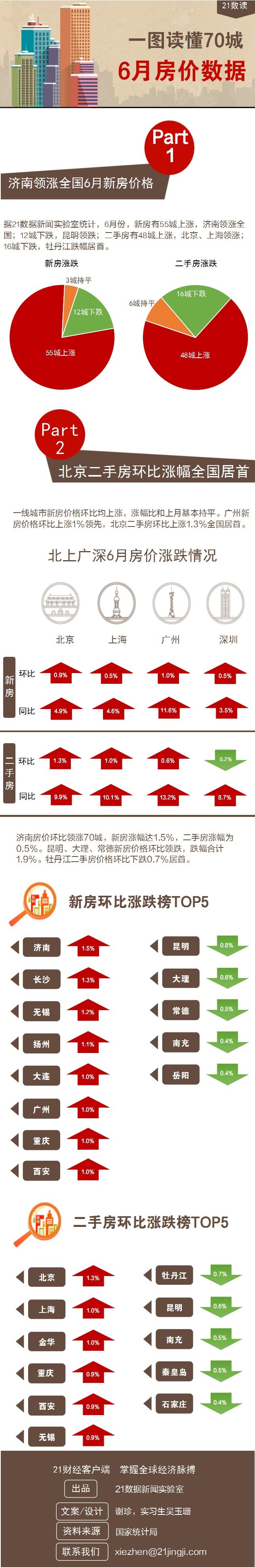 6月份,新房有55城上涨,济南领涨全国;12城下跌,昆明领跌;二手房有48城上涨,北京、上海领涨;16城下跌,牡丹江跌幅居首。