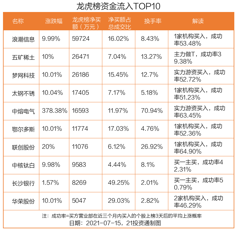 7月15日,上证指数上涨1.02%,深证成指上涨0.75%,创业板指上涨1.4%。盘后龙虎榜数据显示,共有45只个股因当日异动登上龙虎榜,资金净流入最多的是浪潮信息(000977.SZ),达5.97亿元。
