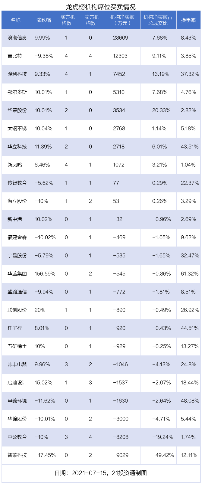 7月15日,24只个股龙虎榜出现了机构的身影,机构合计净买入3.44亿元。具体来看,机构净买入10股,净卖出14股。