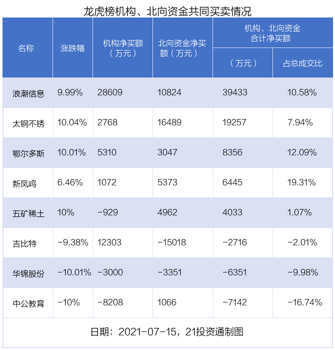 值得注意的是,机构和北向资金共同净买入了太钢不锈、浪潮信息、新凤鸣、鄂尔多斯等4股;共同净卖出了华锦股份;在五矿稀土,中公教育,吉比特上出现分歧。