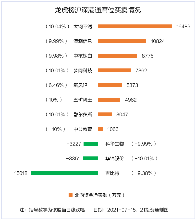 7月15日,北向资金参与龙虎榜中的个股共有11只,合计净买入3.63亿元。其中沪股通净买入2 股,净卖出1 股,合计净卖出6598.33万元;深股通净买入6 股,净卖出2 股,合计净买入4.29亿元。