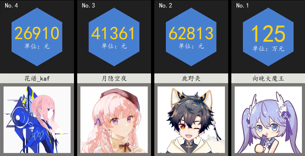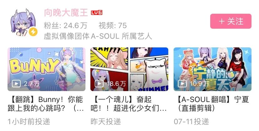 6月12日晚上,隶属于虚拟女子组合A-soul的虚拟主播“向晚大魔王”在B站开启了生日会直播。根据B站up主“虚拟记录者”统计,在当晚时长4小时的直播过程中,“向晚大魔王”共吸引了6900位平台用户为其充值,以平台折扣价计算,仅这一项充值金额就达到了113万元。再加上直播时用户送出的各种礼物和增值道具,截至13日0时,“向晚大魔王”单日吸金达到125万元。