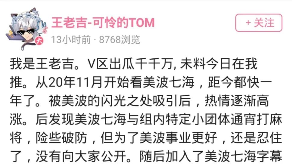不久前,名为“美波七海”的虚拟主播(实为“中之人”)被曝出与某些特殊粉丝通宵游戏,也引发了其他粉丝的不满。小杰说:“虚拟偶像其实也是在经营人设,背后的运营团队的决策影响非常大,遇到更换‘中之人’或者是其他意外导致人设崩塌的情况,通常都是非常致命的。”