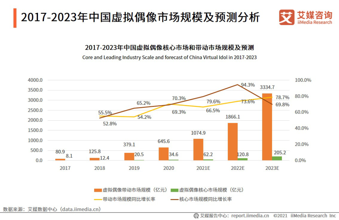 艾媒咨询的另一份数据显示,2020年中国虚拟偶像核心市场规模为34.6亿元,预计2021年将达到62.2亿元、增长率接近80%,这意味着短期内虚拟偶像市场需要有爆发性的产业扩张来满足市场需求。