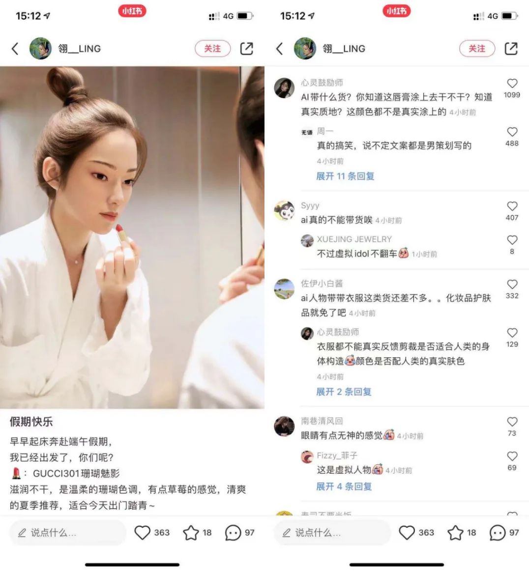 不久前,国风虚拟偶像翎Ling在小红书上首次带货推广某品牌的唇膏时,遭到了平台用户们的群嘲——“AI怎么知道唇膏涂上去干不干?”“这颜色都不是真实涂上去的。”