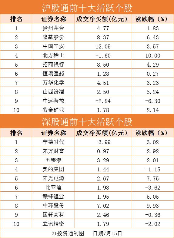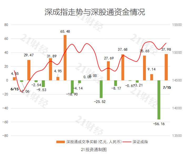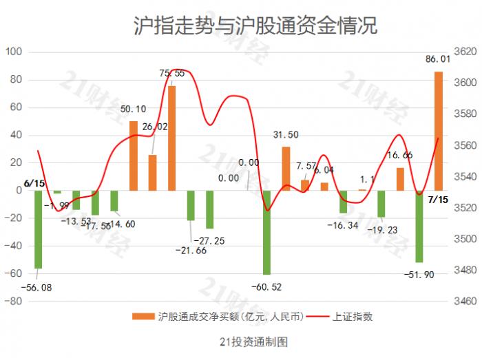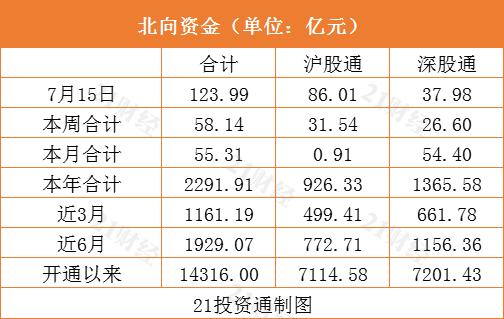据21投资通(微信号ID:touzit21)智能监测,7月15日,北向资金净买入123.99亿元,创6月25日以来新高。其中沪股通净买入86.01亿元,深股通净买入37.98亿元。