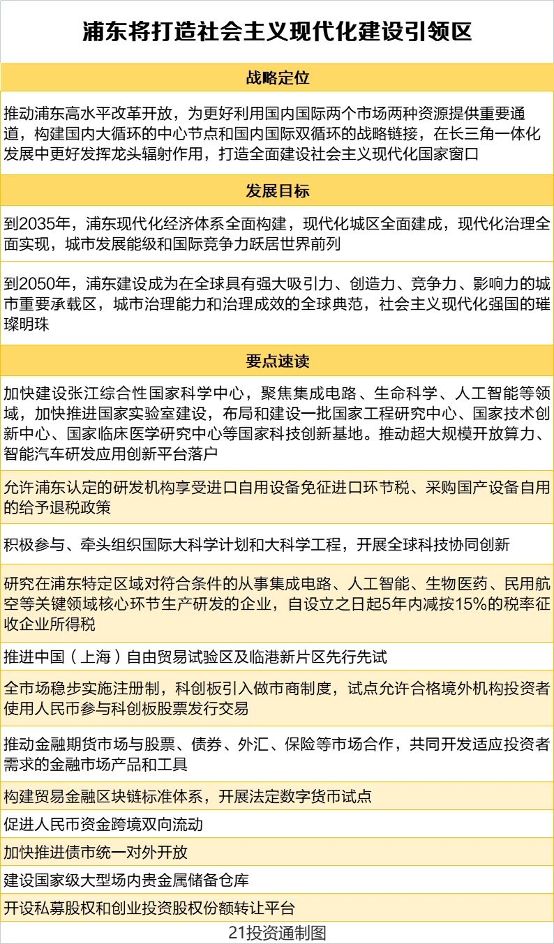 中信证券表示,浦东打造社会主义现代化建设引领区将全力做强创新引擎,打造自主创新高地,聚焦集成电路、人工智能等高新技术领域,实施减税等各类扶持政策,对相关企业的发展形成有力支撑。建议关注中芯国际、韦尔股份、璞泰来、复旦张江等。