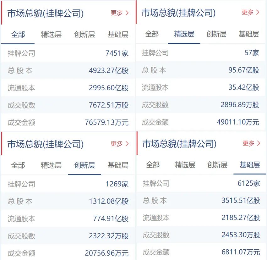新三板挂牌公司总计7451家(精选层57家,创新层1269家,基础层6125家),总股本4923.27亿股,流通股本2995.60亿股。