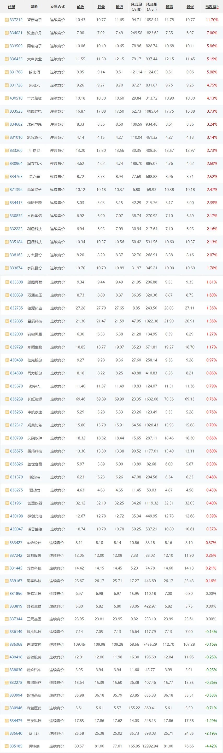 7月16日,精选层普涨,44家企业上涨,3家平盘,10家下跌。其中,智新电子(837212)涨幅居首,上涨11.70%;其次,流金岁月(834021)上涨7.00%;贝特瑞(835185)跌幅居首,下跌4.42%;富士达(835640)居次下跌2.19%;浩淼科技(831850)、颖泰生物(833819)等平盘。