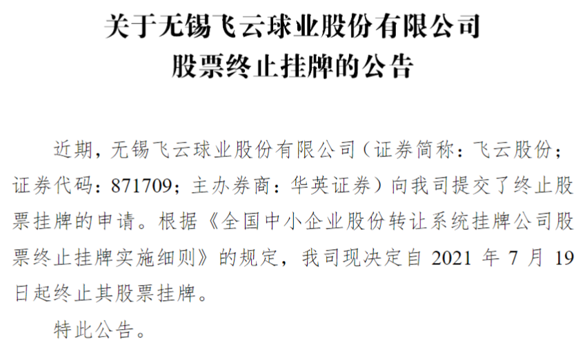 全国股转公告:近期,无锡飞云球业股份有限公司向我司提交了终止股票挂牌的申请。根据《全国中小企业股份转让系统业务规则(试行)》的规定,我司现决定自2021年7月19日起终止其股票挂牌。特此公告。