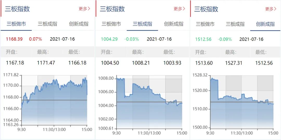 截至7月16日收盘,三板做市报1168.39点,上涨0.07%;三板成指报1004.29点,下跌0.03%;三板创新报1512.56点,下跌0.09%。