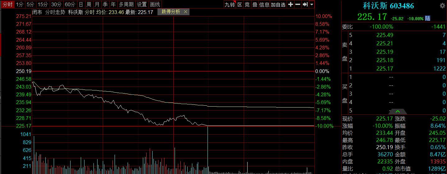 7月16日,科沃斯(603486)开盘后迅速探底,于午盘后跌停至收盘。截至收盘,公司股价报收225.17元,市值蒸发超过140亿到1289亿。
