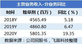 分业务看,公司的主营业务主要分为除草剂、杀虫剂和杀菌剂三类,其中除草剂占公司营收的80%以上,为公司的主要收入来源。由于除草剂占比较大,自然对公司营收增长的贡献大。2020年,该业务实现收入58.01亿元,同比增长19.35%。