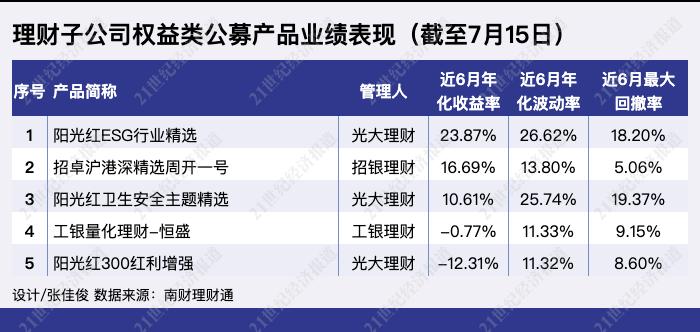 本期以“近6月业绩表现”为指标,共有5只理财子公司权益类公募产品上榜,包括光大理财的“阳光红ESG行业精选”、“阳光红卫生安全主题精选”和“阳光红300红利增强”,招银理财的“招卓沪港深精选周开一号”和工银理财的“工银量化理财-恒盛”。