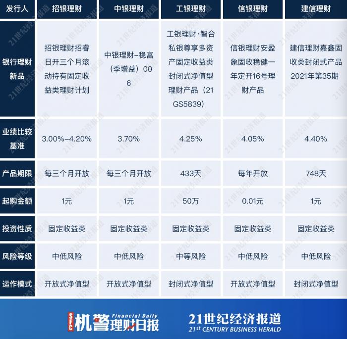 本期理财新品均为固收类产品。其中,工银理财推出的“智合私银尊享多资产固定收益类封闭式净值型产品(21GS5839)”面向私人银行客户,起购金额为50万元,业绩比较基准为4.25%,认购时间从7月15日-7月21日。建信理财嘉鑫固收类封闭式产品2021年第35期业绩比较基准也不低,为4.40%/年。据产品说明书,该款产品投资固定收益类资产、现金类资产的比例为 80%-100%,非标准化债权类资产的比例为 0%-50%(不含),策略方面综合运用杠杆套息、利差交易、久期调整等投资策略对投资组合进行收益增厚。