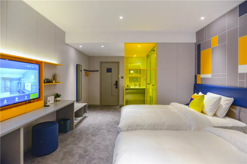 SwimmingPool Studio 三也室内设计李麟杰也表示,相比于老7天, 7天品牌VI的深空蓝和光之黄鲜明且有记忆性,在色彩比例和材料配搭的不断优化下,达到平衡,空间显得更加年轻、时尚、自由,让消费者在这样的住宿空间“不7而遇”,惊喜的同时带来了趣味性和场景感。这实际上也是根据客群的变化和时代美学的发展发生的色系美学变革。