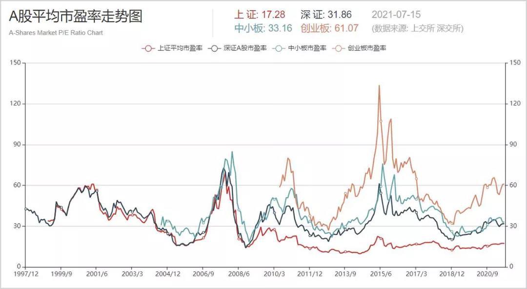 第二张图是各大指数的平均市盈率历史走势图,目前上证PE17.28倍,深证PE31.86倍,都处于历史中等偏低的位置;创业板PE61.07倍,处于中等略偏高的位置,其最近一轮牛市涨幅接近3倍,指数点位甚至在本周一度超过上证。