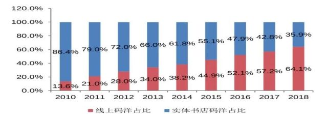 图:2010-2018年线上渠道、实体书店码洋占比(数据来源:西南证券)