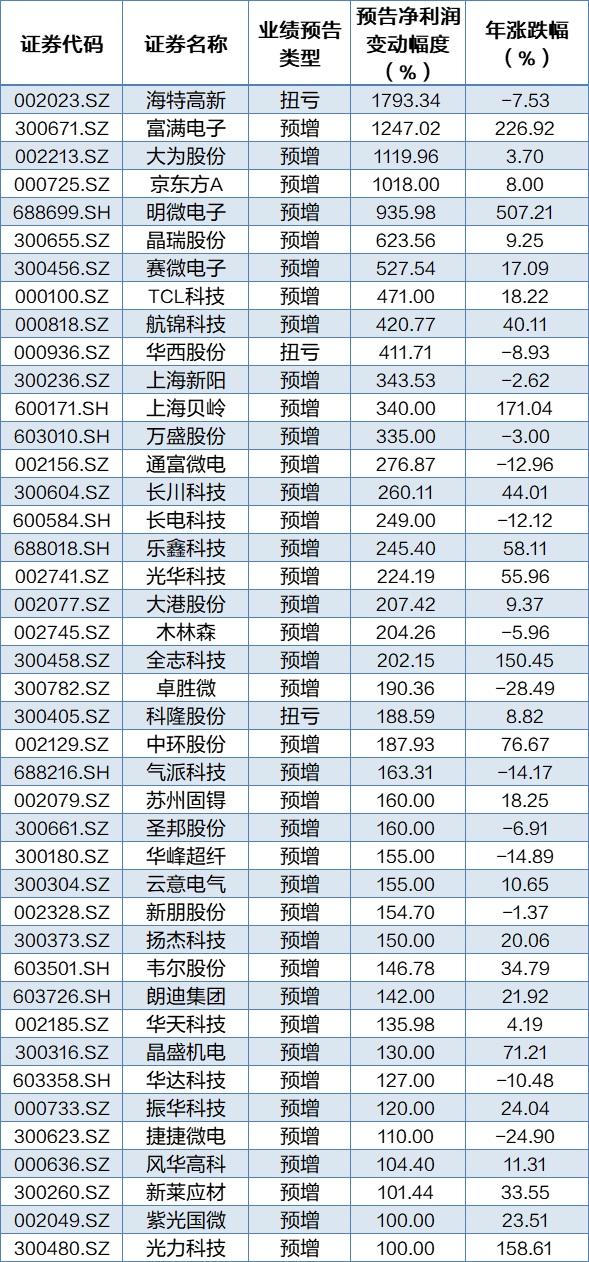 (△部分中报预告业绩超10倍的芯片及集成电路公司,数据来源同花顺)