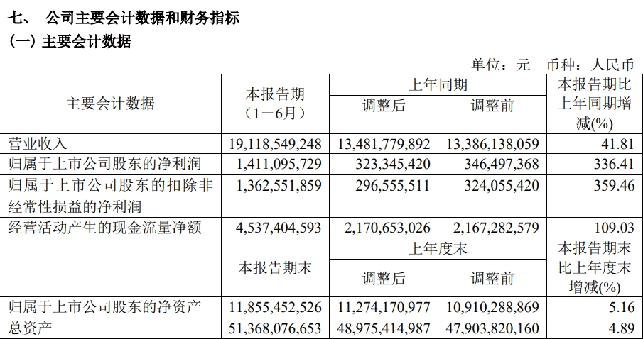具体来看,西部矿业半年报显示,上半年实现营业收入191.19亿元,同比增41.81%;实现净利润14.11亿元,同比增336.41%。