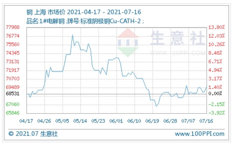 据生意社统计数据,截至7月16日,现货铜报价69673.33元/吨,较7月12日的69496.67元/吨上涨0.25%,较年初上涨20.22%。