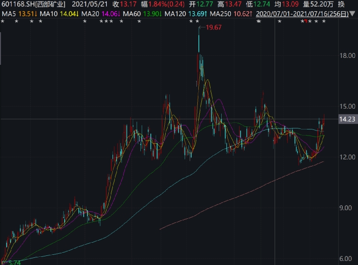 但是随后西部矿业就开启暴跌模式,到一季度末跌至12.43元/股;二季度股价也比较震荡,6月18日出现阶段低点11.51元/股,最近则有所反弹,7月9日还涨停了,截至7月16日收盘,西部矿业报收14.26元/股,最新总市值为340亿元。