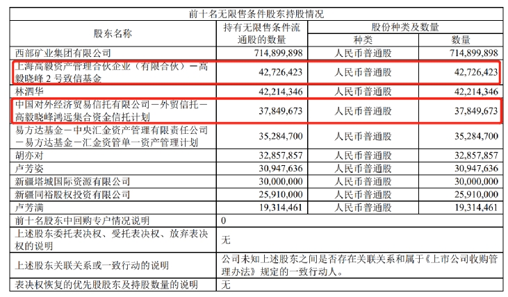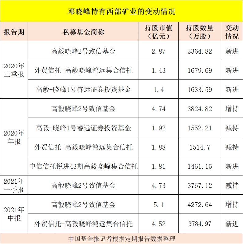 邓晓峰早在2020年三季度末就出现在西部矿业的前十大流通股东名单,彼时,高毅晓峰2号致信基金、外贸信托-高毅晓峰鸿远集合资金信托计划和高毅-晓峰1号睿远证券投资基金新进该股,合计持股6678.10万股,合计持股市值为5.7亿元。