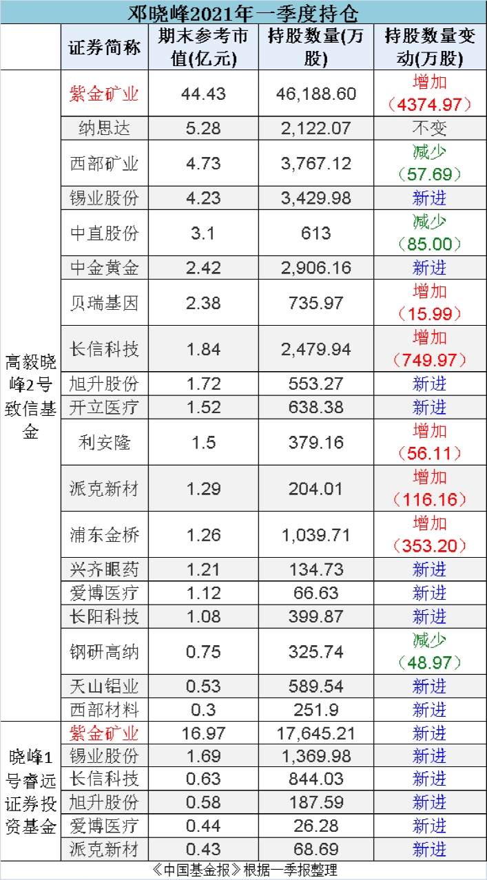 此前公布的一季报显示,邓晓峰还持有紫金矿业、天山铝业、中金黄金、合盛硅业、锡业股份等,我们可以关注二季度的持仓变化情况。